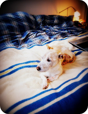Lucy and I are relegated to the bedroom and other parts of the house today while Andy uses some kind of toxic stuff to get the gunk off the living room floor in preparation for painting it. The bedroom is completely painted, and completely undecorated right now, a minimalist look that I'm rather enjoying for the moment.