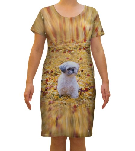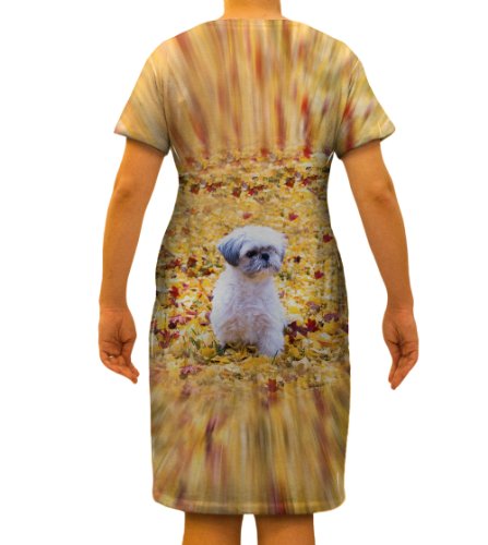 Shih Tzu Amongst The Autumn Leaves. This dress is exquisite for day or evening wear. Its stretchy and comfortable and super easy to care for. Wear it for school or a casual night on the town. Each print is done one at a time in our USA facility to your specific order. This is a unique water based dye process where the image becomes a permanent part of the garment. We guarantee it will never peel, crack or flake like a regular print. So soft and comfortable you will want to sleep in it! Cold machine wash , hang dry recommended. 95 Percent Microfiber-Poly/5 Percent Spandex. Keep in mind that this environmentally safe method leaves decorative white lines and striations in crease areas that is a natural part of the process. This normally occurs under the arm and in the nooks and crannies around edges. Please be familiar with the fabric and process before ordering (see product images). Yizzam proudly offers products through the following brands: AnimalShirtsUSA, ArtsyClothingCo, ArtNouveauCo, NewWorldCo, RetroComicsUSA, FoodKingUSA, PatriotWearUSA, CamoWearUSA, FoodKingUSA, WinKingUSA, TieDyeKingUSA.