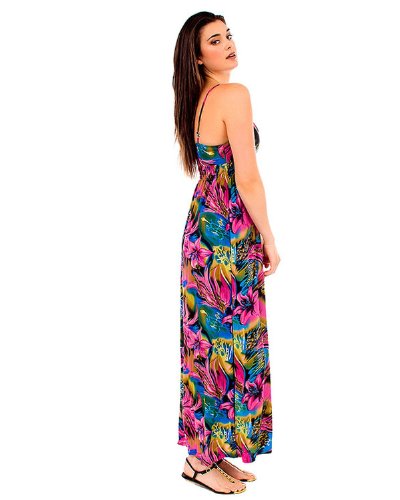 Colorful and fun for the summer, this long printed maxi dress featues spaghetti straps and a smocked waist.