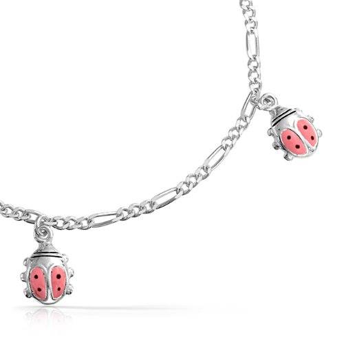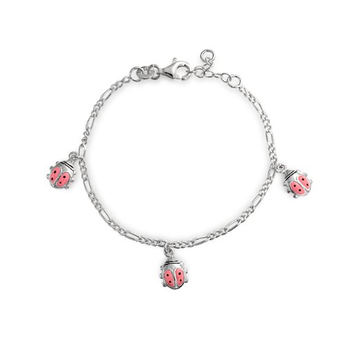 This little girls silver charm bracelet is simply adorable. A pink ladybug charm bracelet is the perfect gift for the little bug in your life. A dainty sterling silver Figaro chain is accented with three little bug charms that wiggle and jiggle. Every little lady loves jewelry and this little girl jewelry is sure to please. If you are looking for the perfect birthday gift for a niece or goddaughter, this is just what you need to make her happy. Made from quality sterling silver will not irritate like brass or alloy metal and will not turn your skin green. Buy this today at a great price and be confident that it will please.