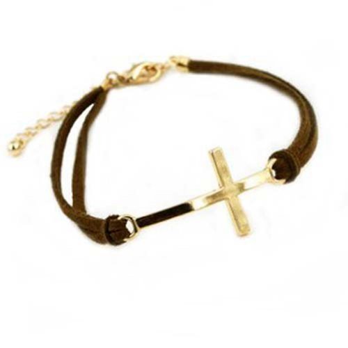 \Adjustable Fashion Trendy Gold Plated Leather Sideways Cross Bracelet For Women Men
